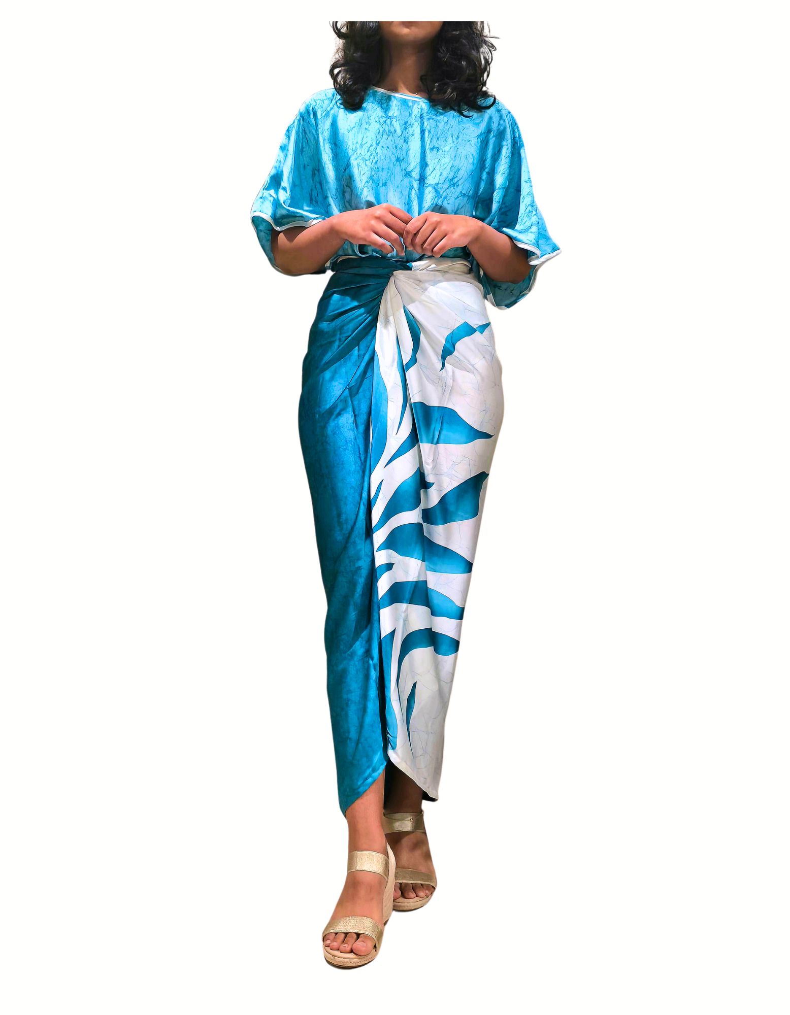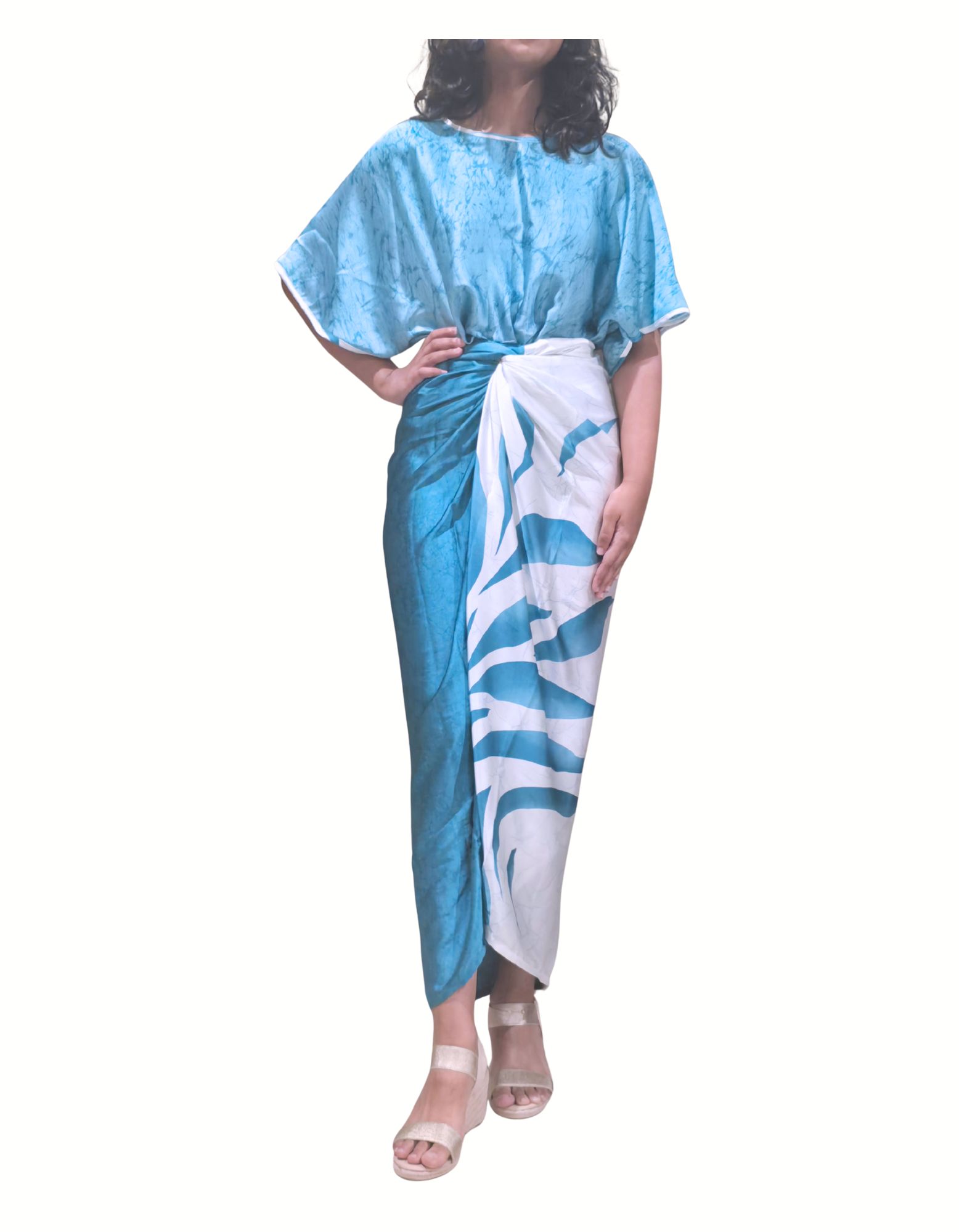 Blue and white satin silk two-piece.