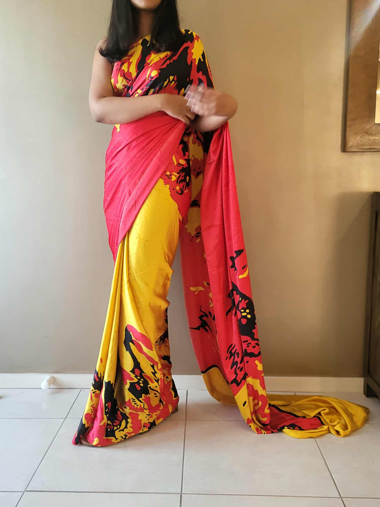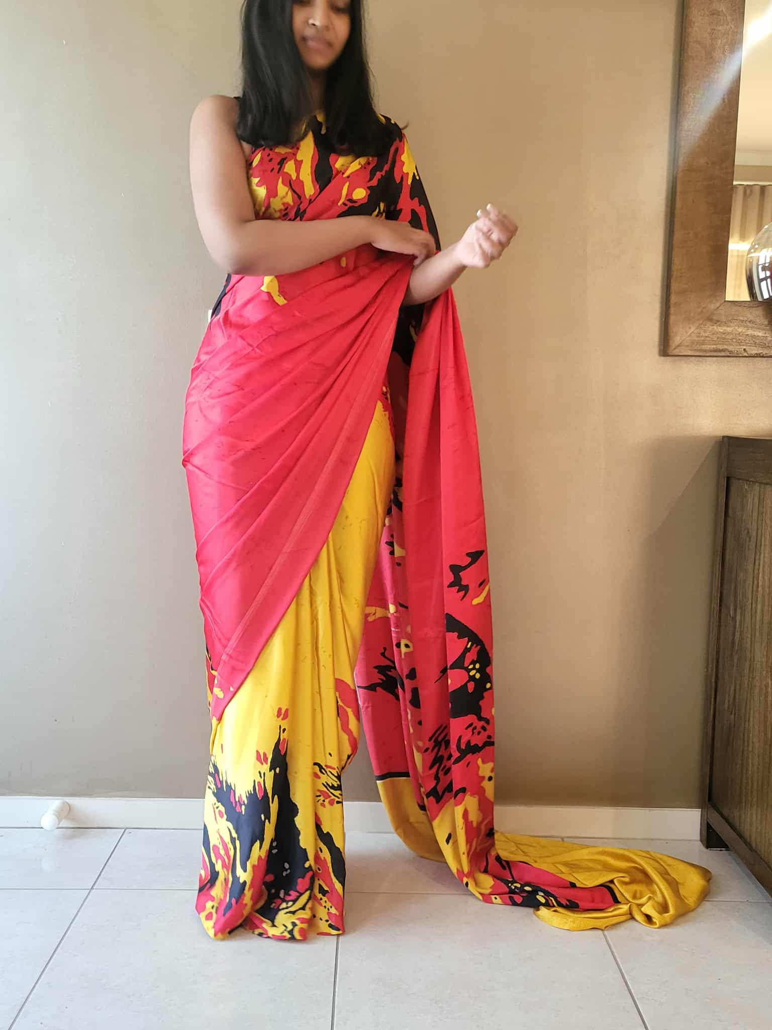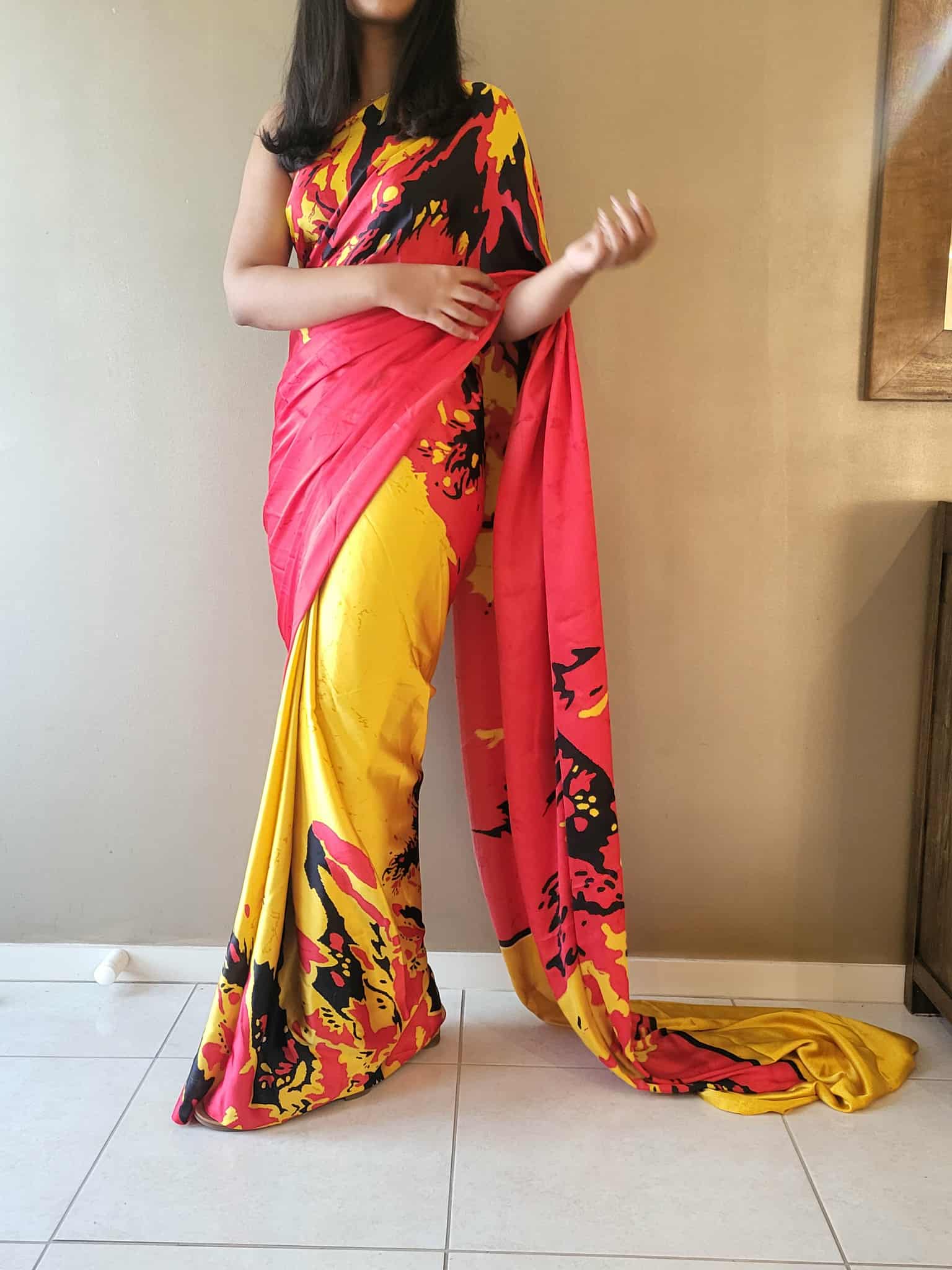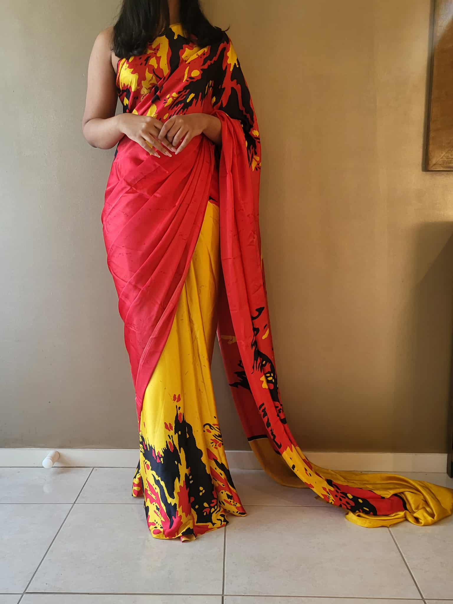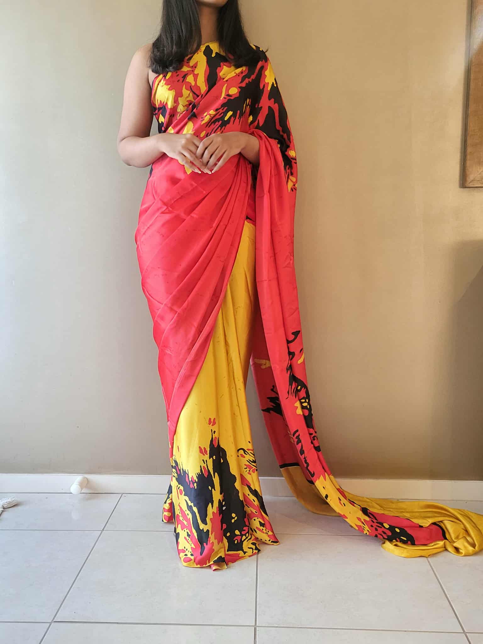 Wrapped in the fiery grace of red, the sunshine of yellow, and the bold mystery of black — this saree is where colors tell a story.”