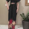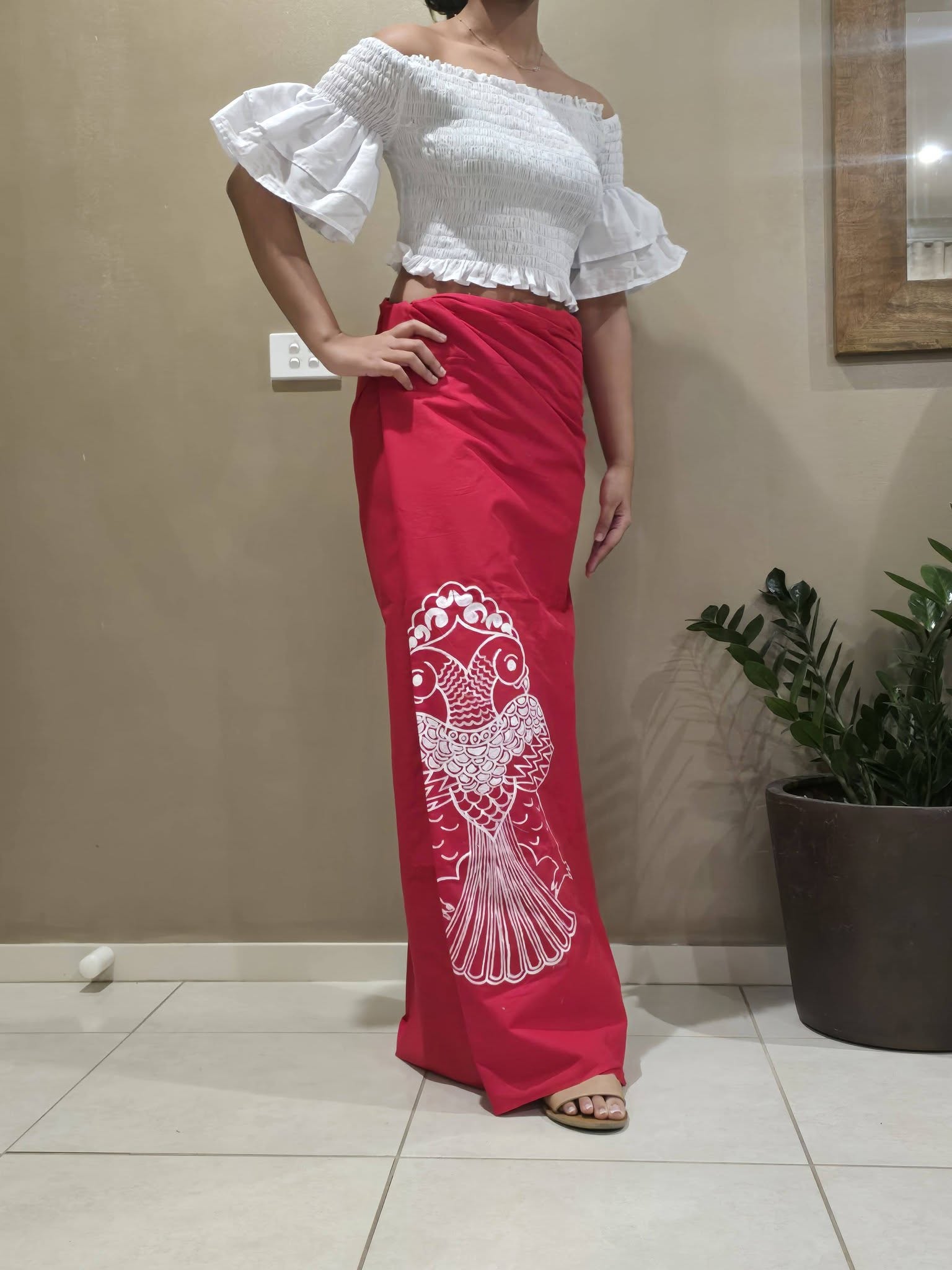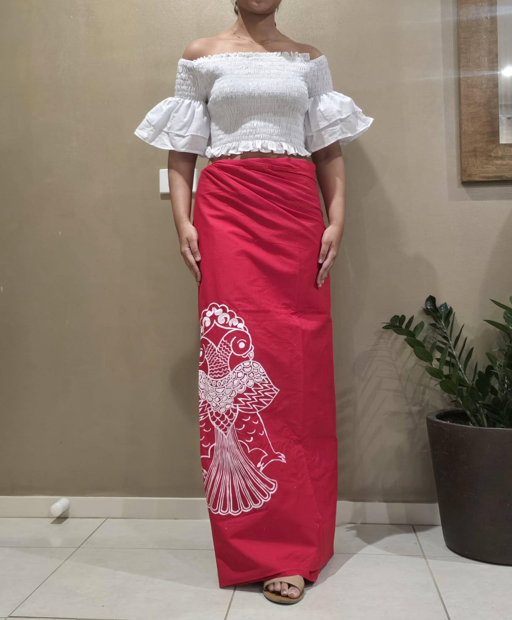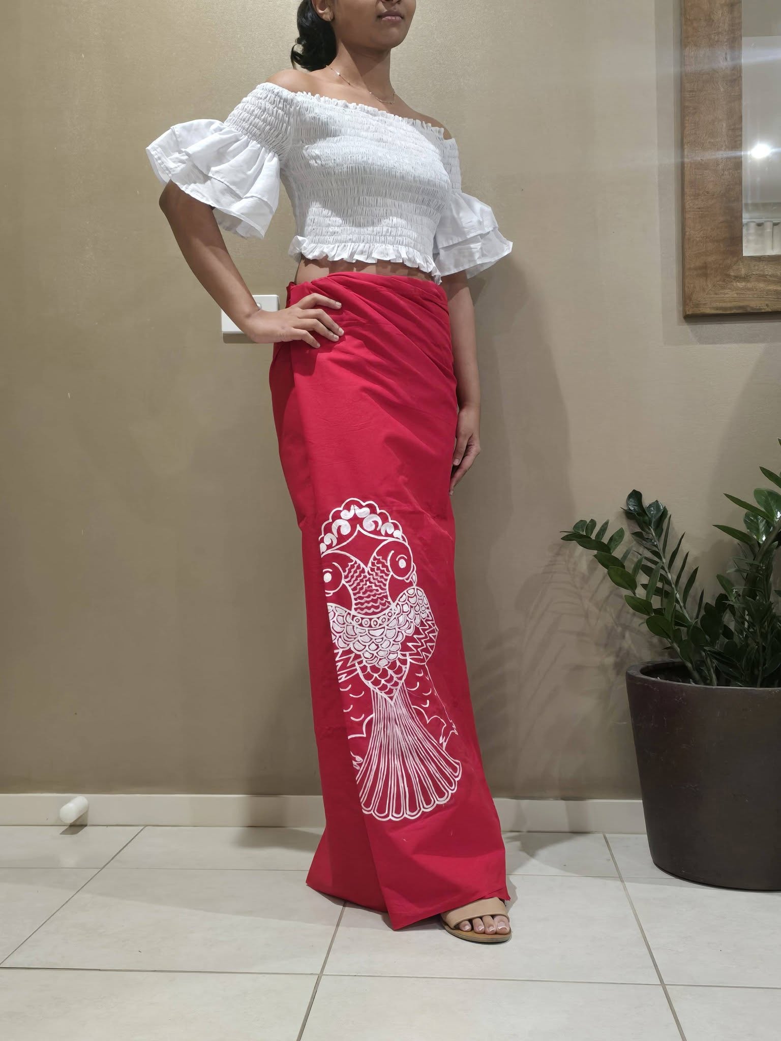 Red colour sarong with white painted design.