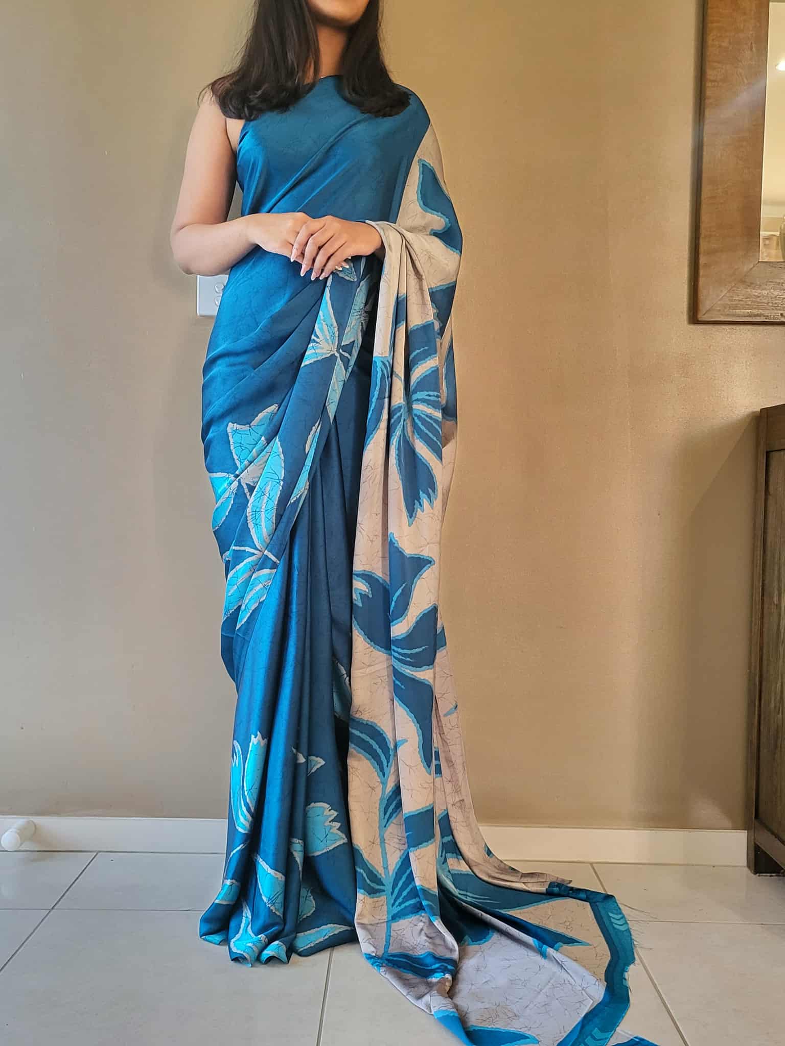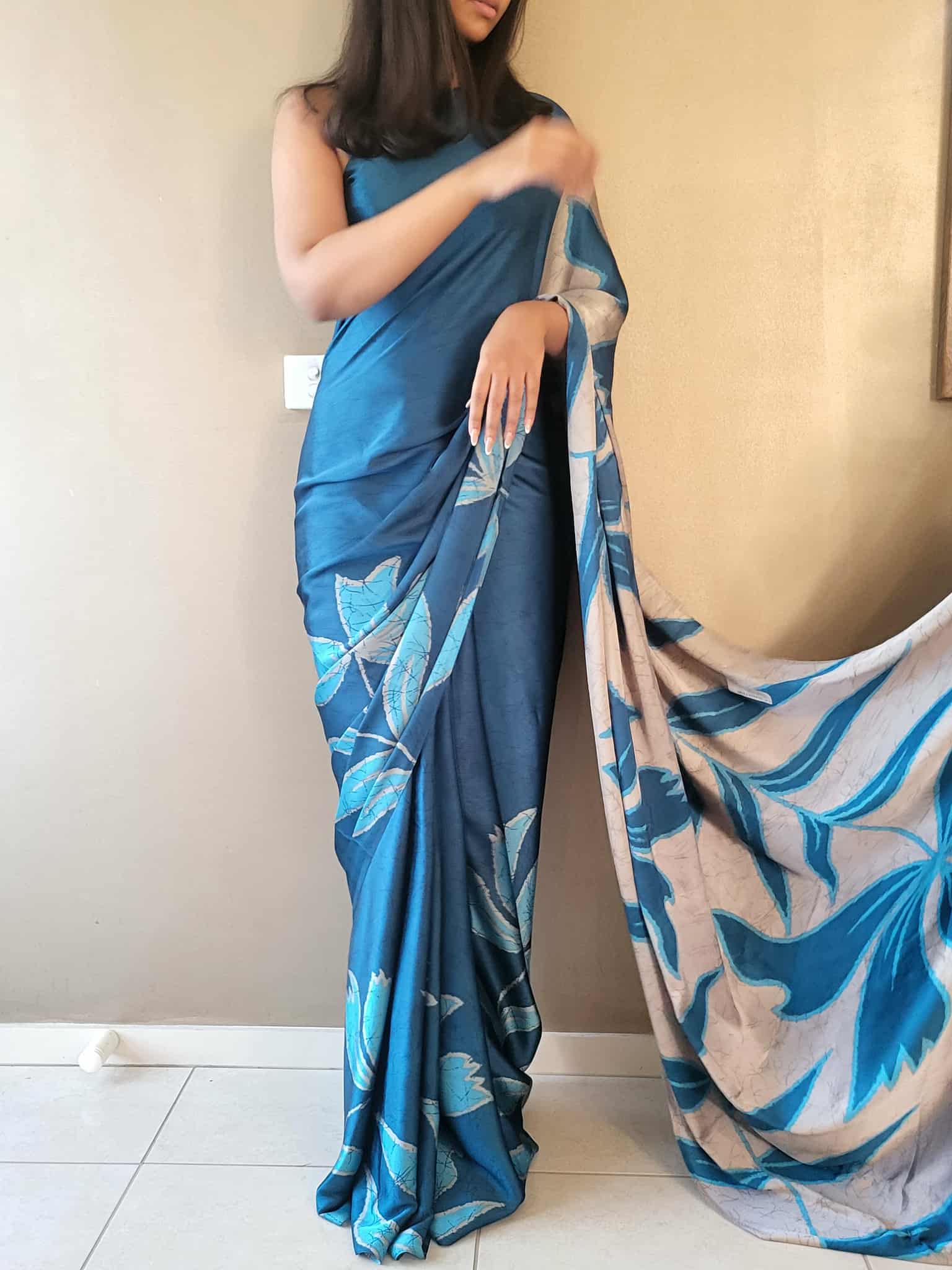 Make heads turn with this stunning blue and grey saree – elegance, redefined